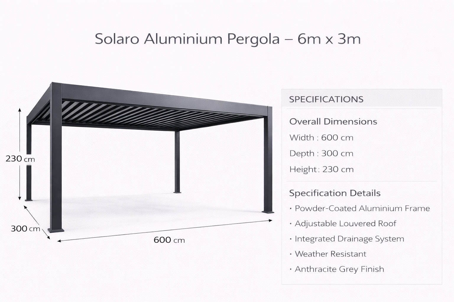 With an impressive 6 metre width and 3 metre projection, this pergola provides generous space for outdoor dining sets, lounge furniture, or complete outdoor kitchen and entertaining areas. The extended span makes it ideal for larger patios and open garden layouts.