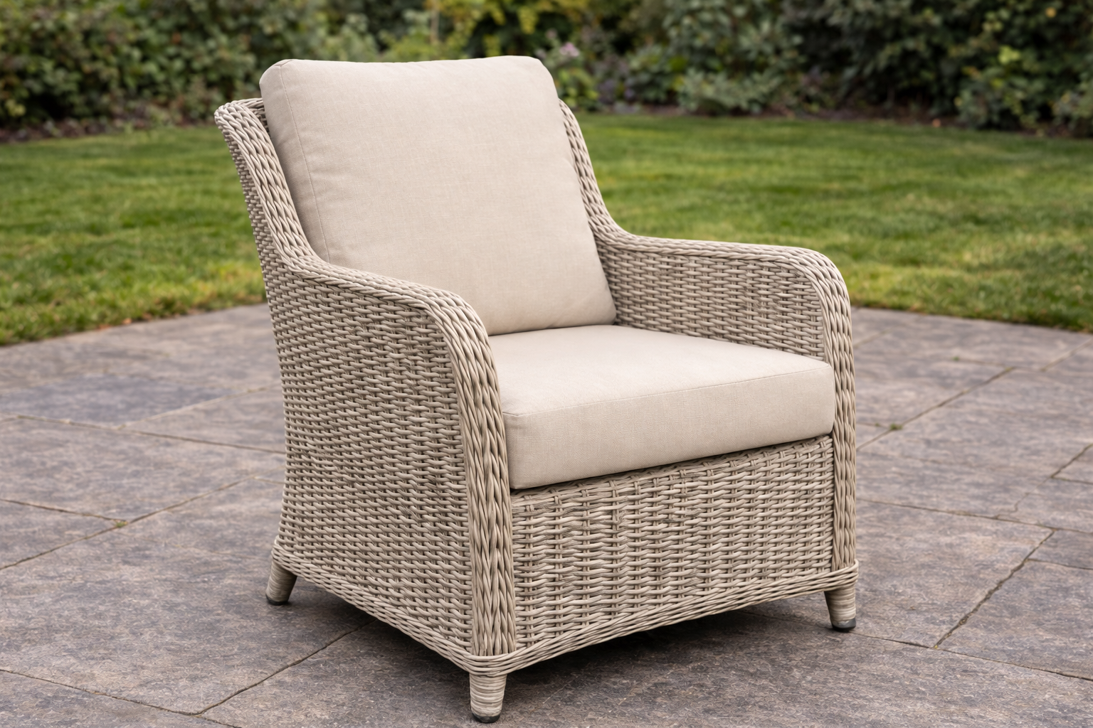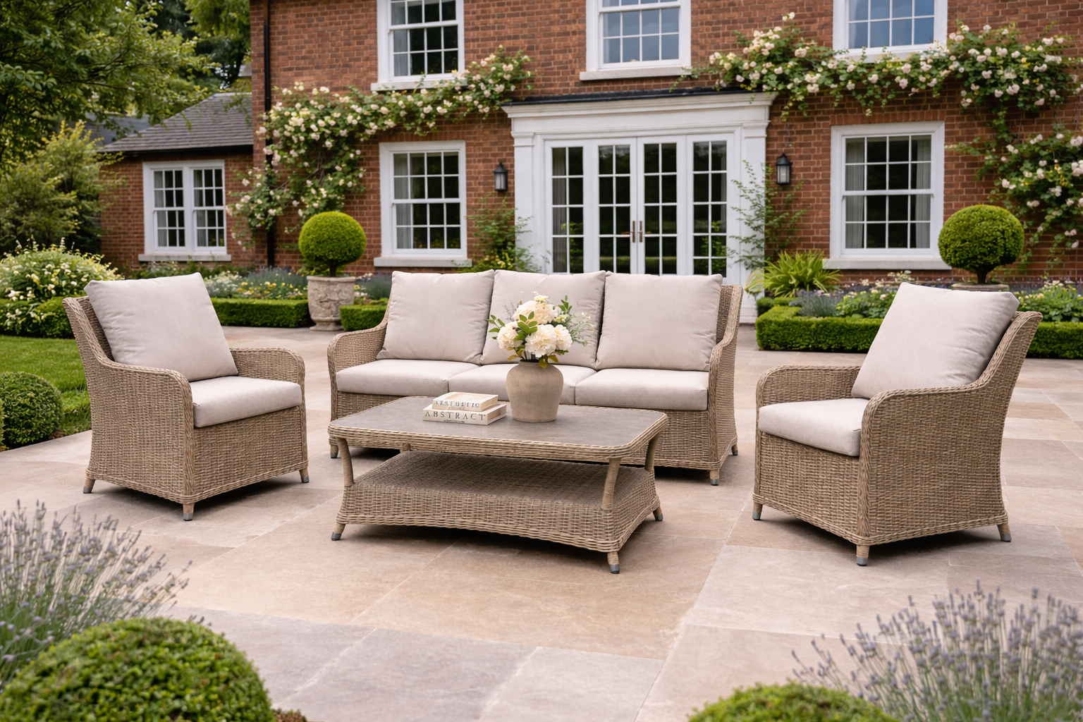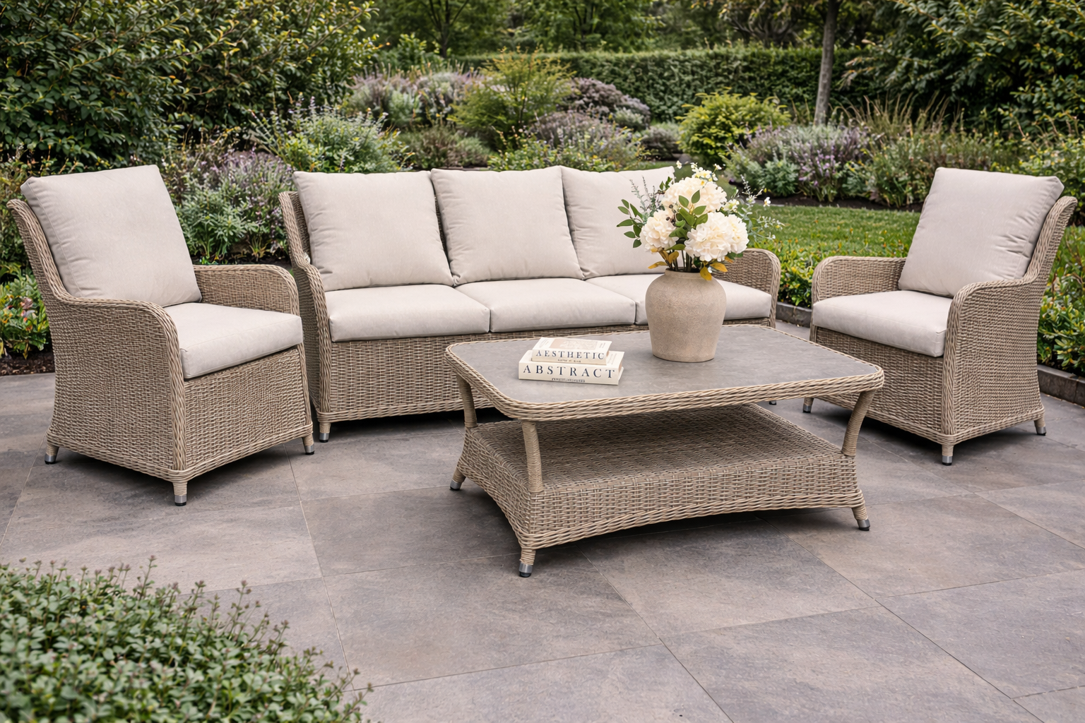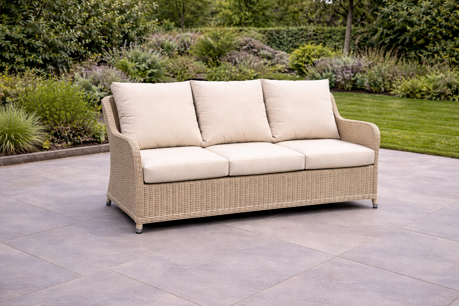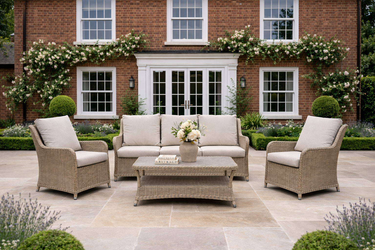 The Alderwick 3 seater lounge set blends refined outdoor styling with everyday comfort. Hand-woven in light ash PE rattan and paired with structured square padded cushions, it creates a clean, architectural look suited to modern patios and landscaped gardens.