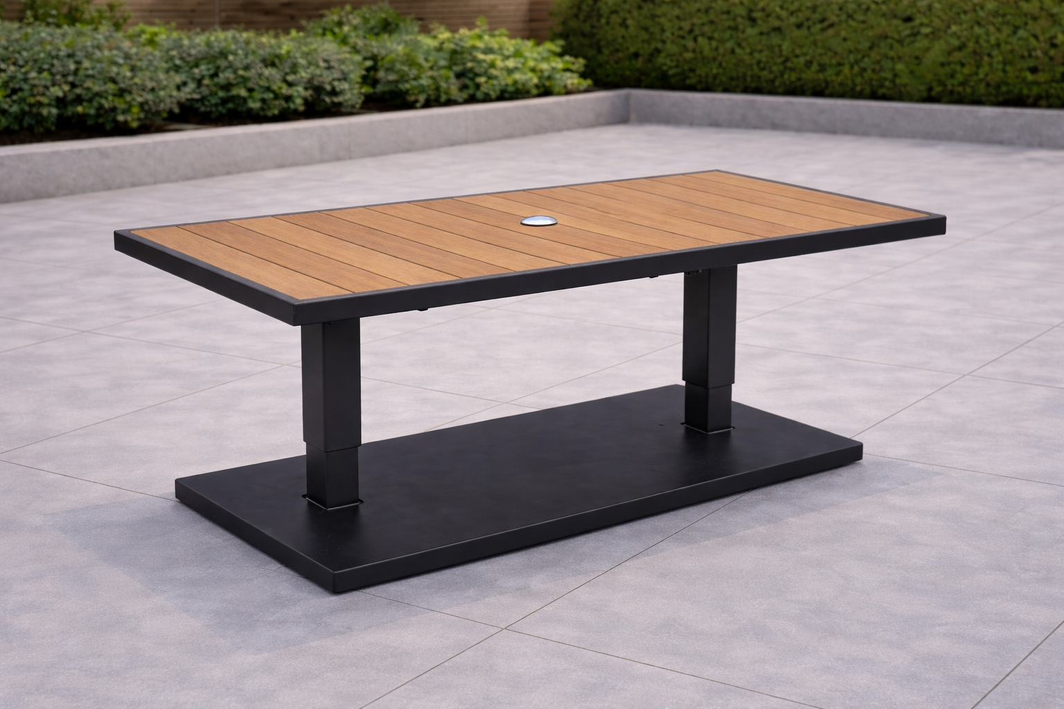 The Arden Corner Lounge with Rising Table combines modern aluminium construction with practical versatility, making it ideal for both relaxed lounging and outdoor dining.
