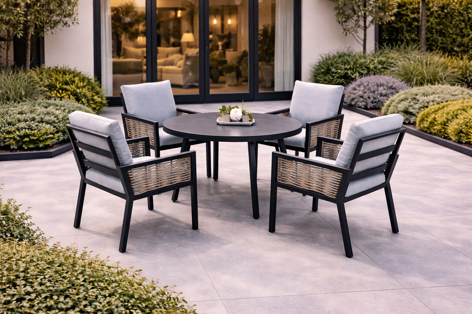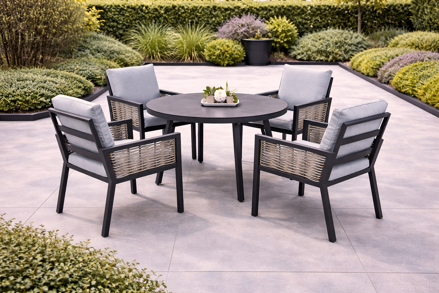 Featuring a circular dining table and four matching armchairs, this set creates a balanced and sociable layout ideal for everyday outdoor use. The round table design encourages conversation while maintaining a clean, contemporary presence within modern garden settings.