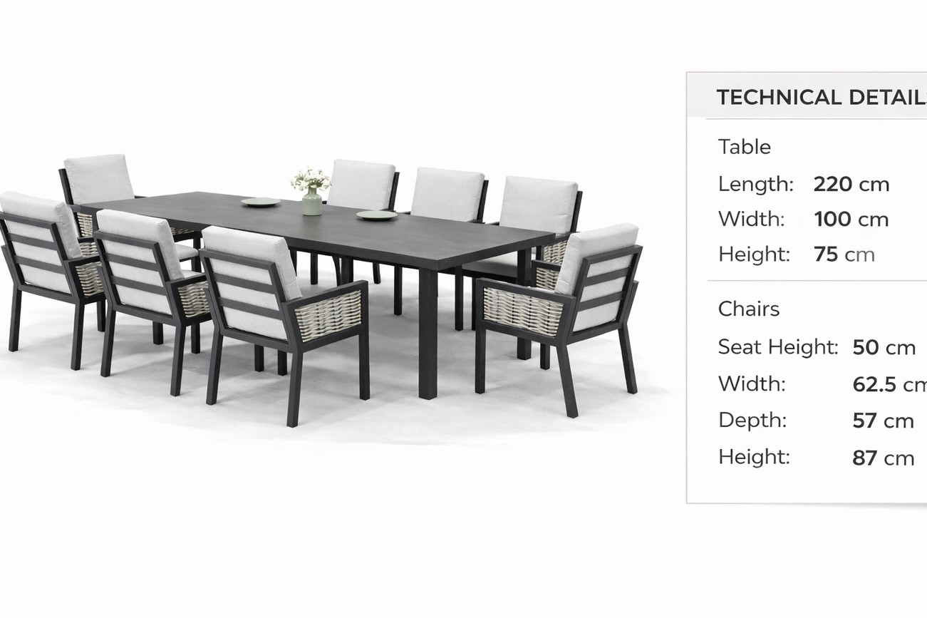 The Huxley 8 Seat Dining Set is designed for homeowners who want generous outdoor dining space without compromising on modern design.