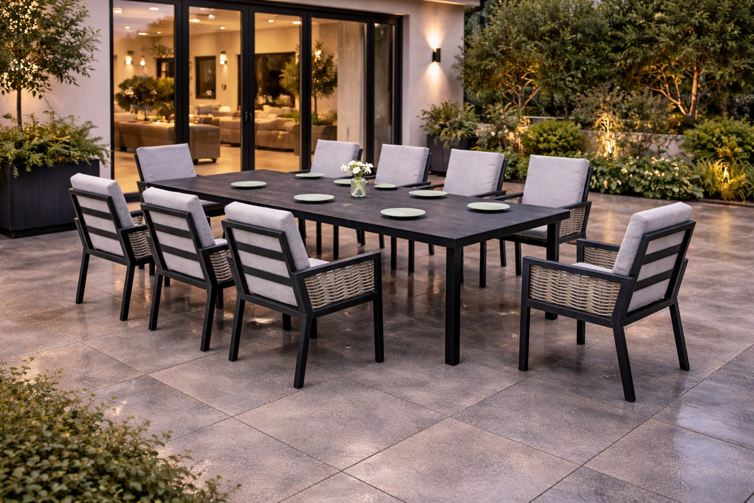 Built around a substantial rectangular table and eight matching armchairs, this set creates a strong architectural centrepiece for larger patios and landscaped gardens. The clean-lined frame and woven panel detailing give the Huxley collection its distinctive character — structured, refined and built to last.